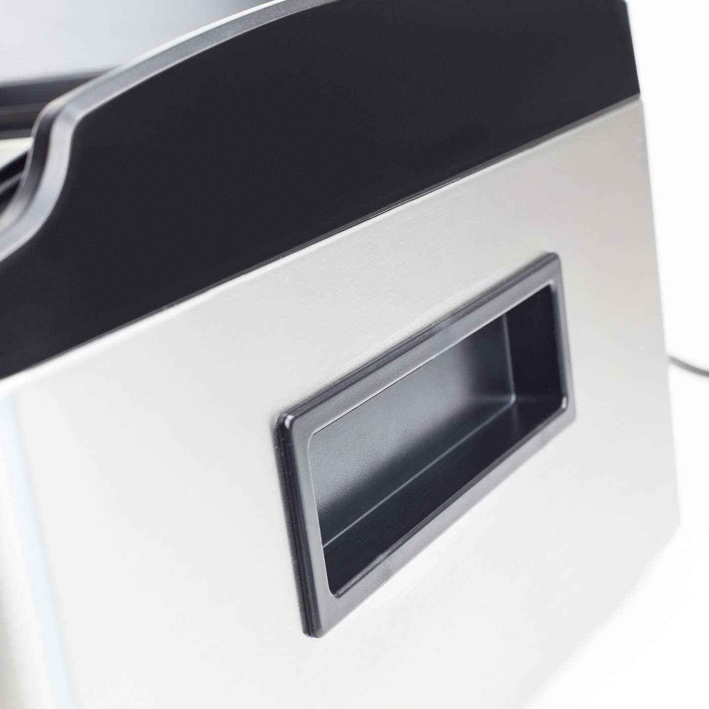 - Geschlossene Vakuumkammer mit gewölbtem, transparentem und extra starkem Glasdeckel (Temperglas)